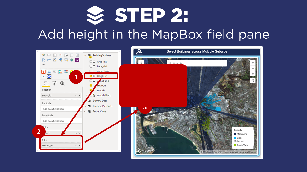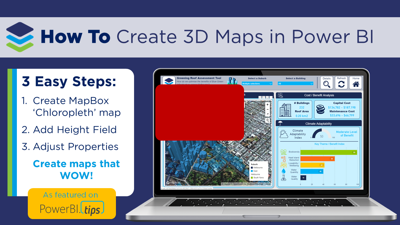 In our example, we create a 3D map of buildings across Melbourne as part of a ‘Green Roof’ assessment tool to help optimise the benefits of blue-green infrastructure across Melbourne. Note that we have anonymised this data and the calculations so that we can share it with the Power BI community (for demonstration purposes only!).
