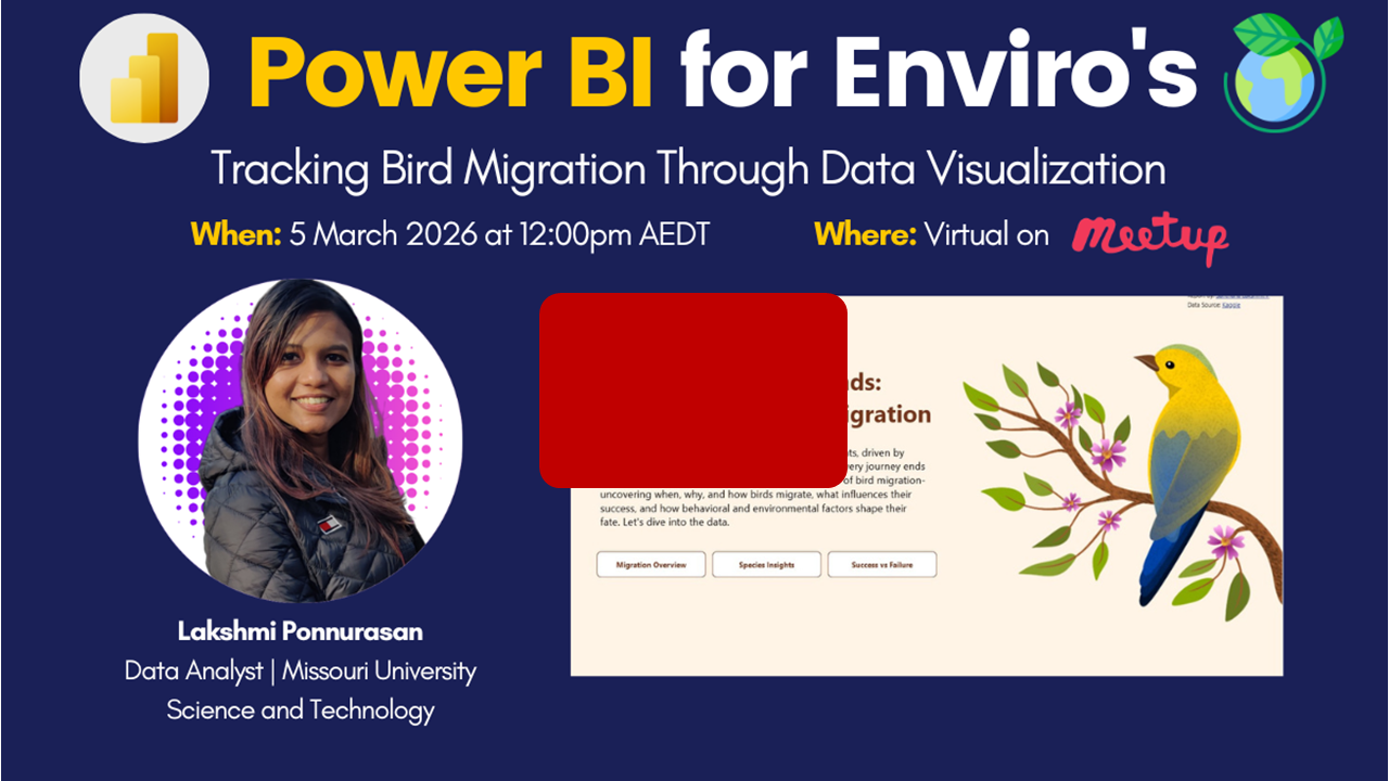 This session guided attendees through the journey of turning raw migration data into an engaging, easy-to-understand Power BI report designed with end users in mind, using a bird migration dataset. From the first look at the dataset to the final interactive experience, Lakshmi’s focus was on clarity, thoughtful design, and practical usability for environment professionals. She showcased the final report, the design decisions behind each visual, and explained how accessibility was considered throughout the process. She also reflected on what she would improve if the report was re-built today, and shared a few practical tips and tricks that others can apply to their own analytics projects.