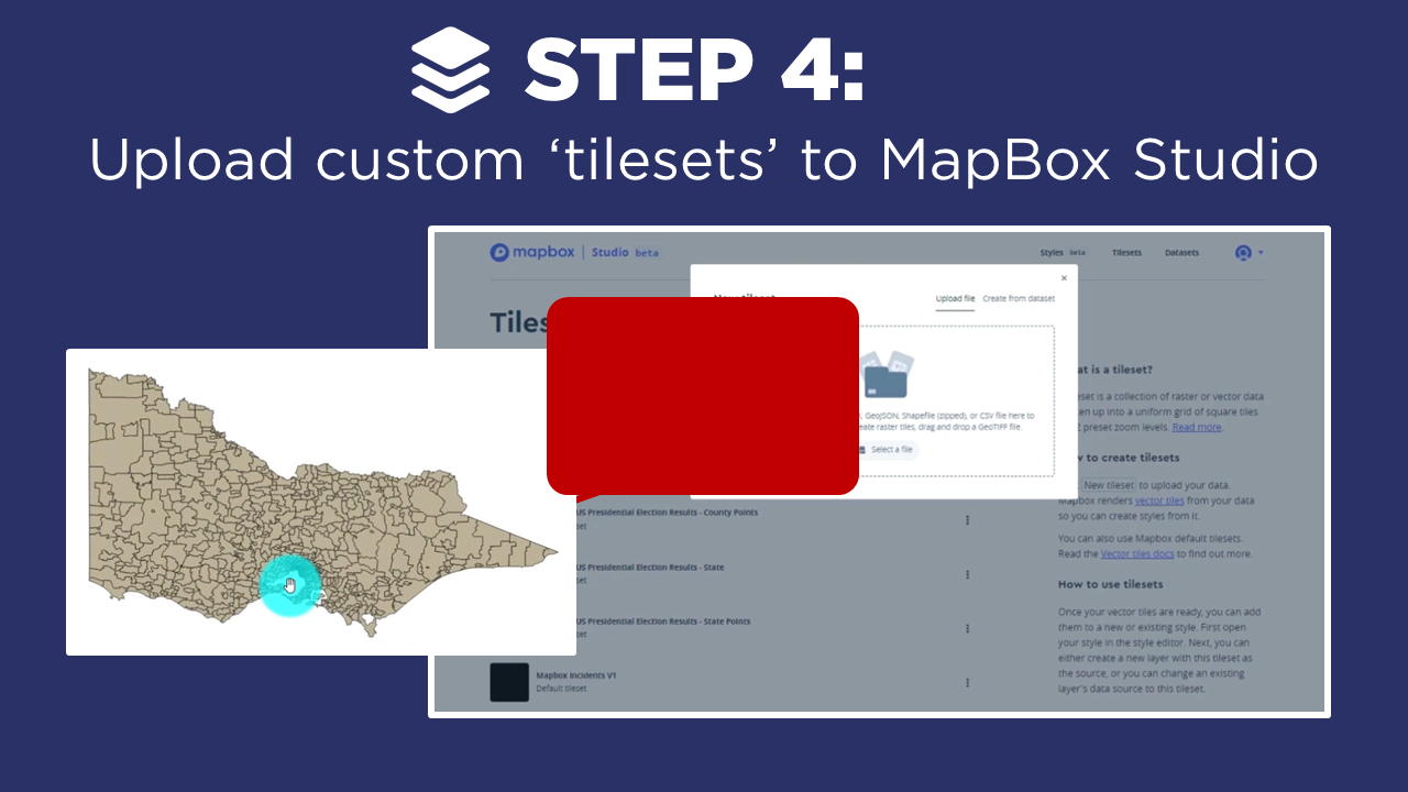 Now given MapBox has 5 different map types to choose from (heat, circle, cluster, raster and chloropleth), it’s really important to select the right map type to suit your data. In our example, these points actually represent postcodes, which would be much better to display as area regions (or polygons). And we can do that too in MapBox by creating a chloropleth map (just a fancy word for an area map) with our own custom tilesets… So let’s head to Step 4.