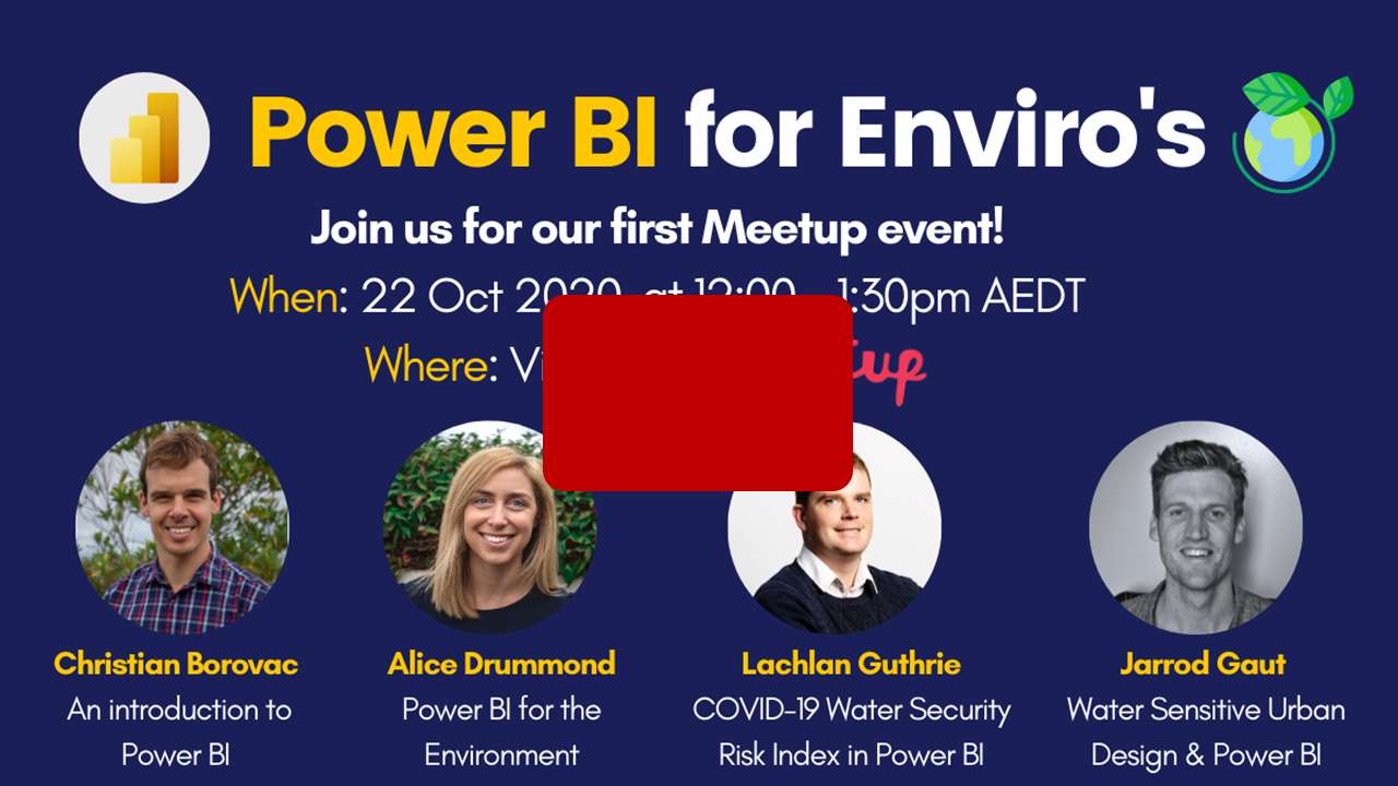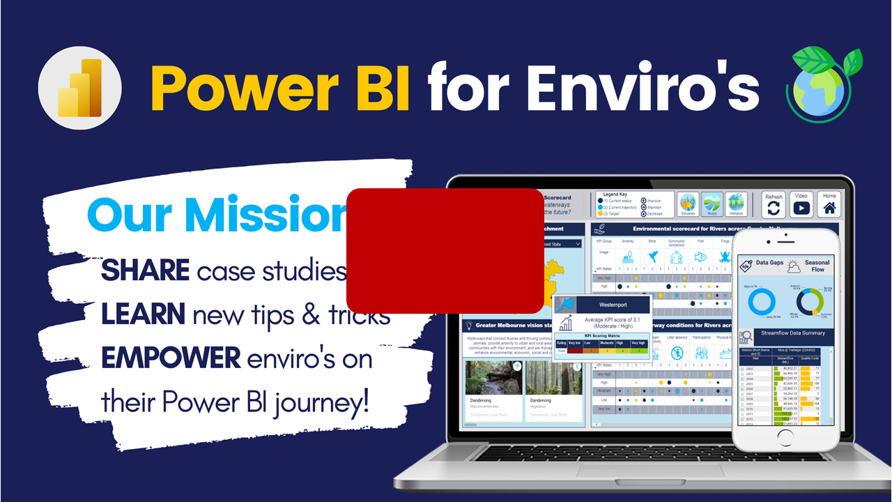 In October 2020, Alice and I started running the monthly "Power BI and Data Analytics for Enviros" meetup group, to share tips, tricks and hacks for analysing, visualising and communicating environmental data. The group is focused on building a culture and excitement around how we can visualise environmental data to help monitor and manage our environmental systems and challenges. The sessions are focused on Sharing case studies, Learning new tips & tricks and Empowering other enviros on their Power BI and data analytics journey.