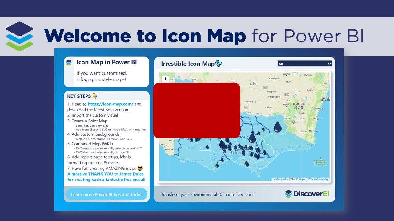 Working across the environmental industry – it’s fair to say that pretty much ALL of DiscoverEI’s Power BI reports have a map! And if you thought that MapBox was good, well you’re going to LOVE the Icon Map custom visual in Power BI – which allows you to display interactive polygons, points, lines and of course – icons, all in the one visual…plus so much more!